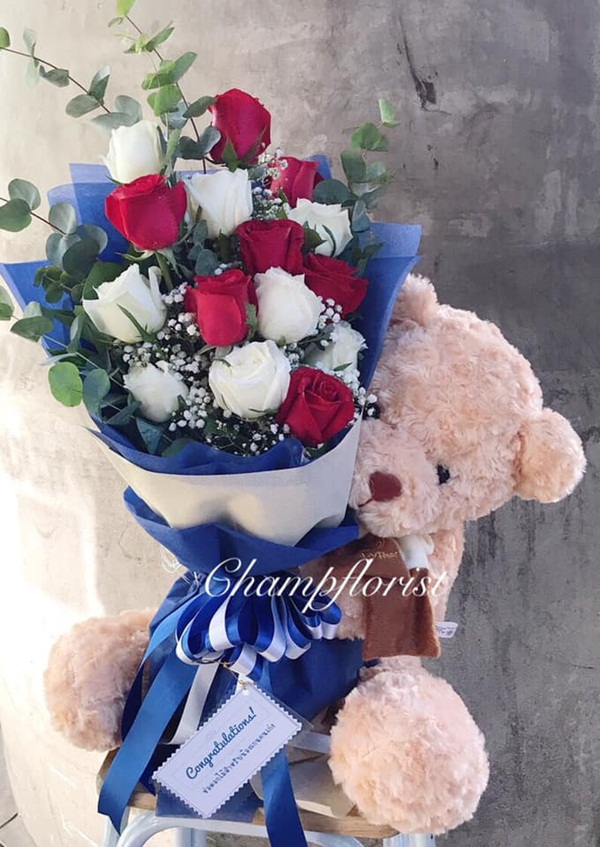 ช่อดกไม้กับน้องหมี กุหลาบแดง 7 ดอก กุหลาบขาว 8 ดอก แต่งด้วยใบยูคากับยิโซ